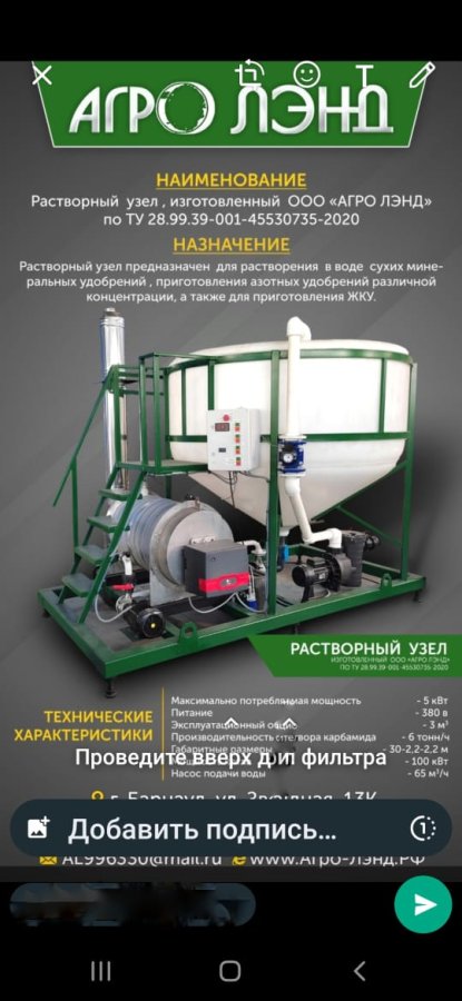 Предназначен для растворения в воде сухих минеральных удобрений, приготовления азотных удобрений различной концентрации (КАС 28-32), а также приготовления ЖКУ.