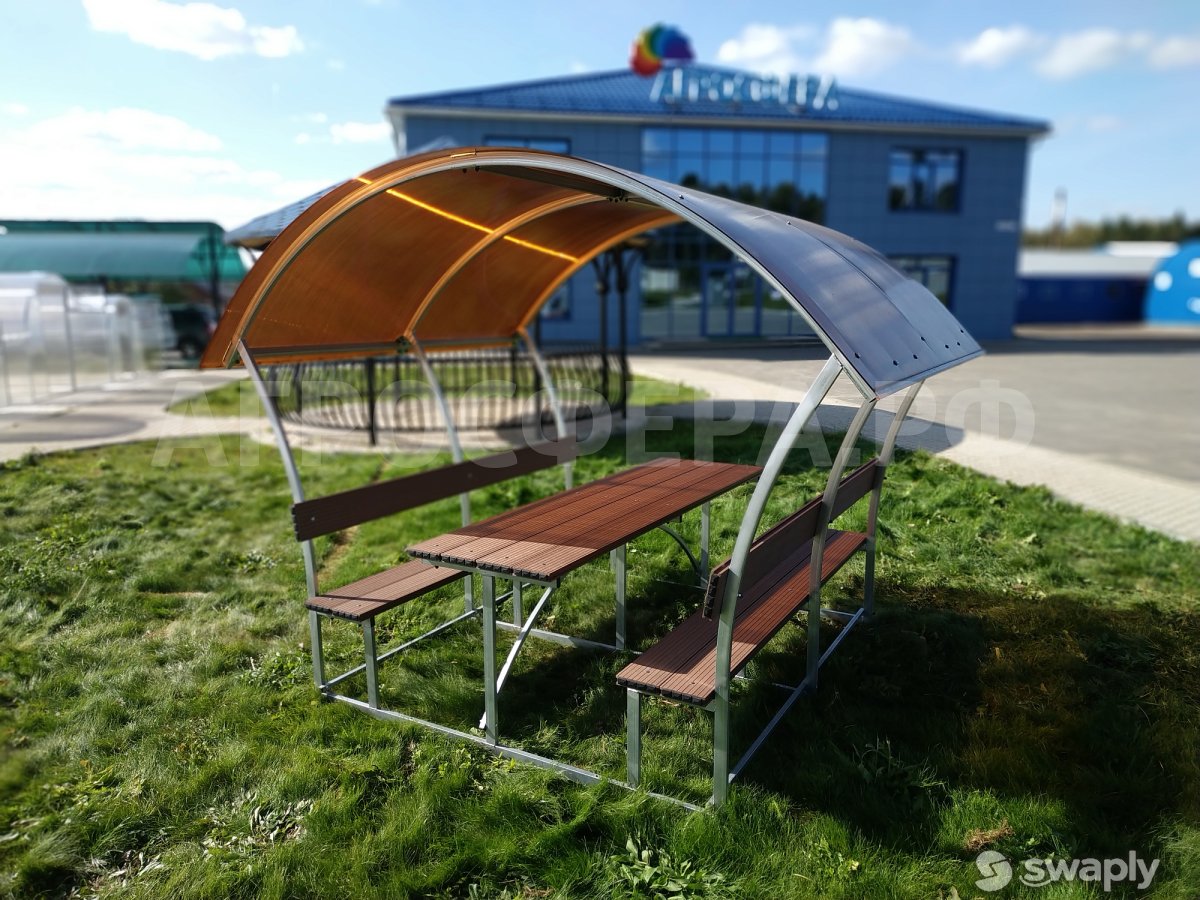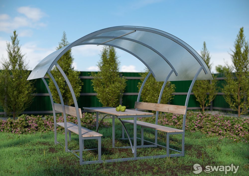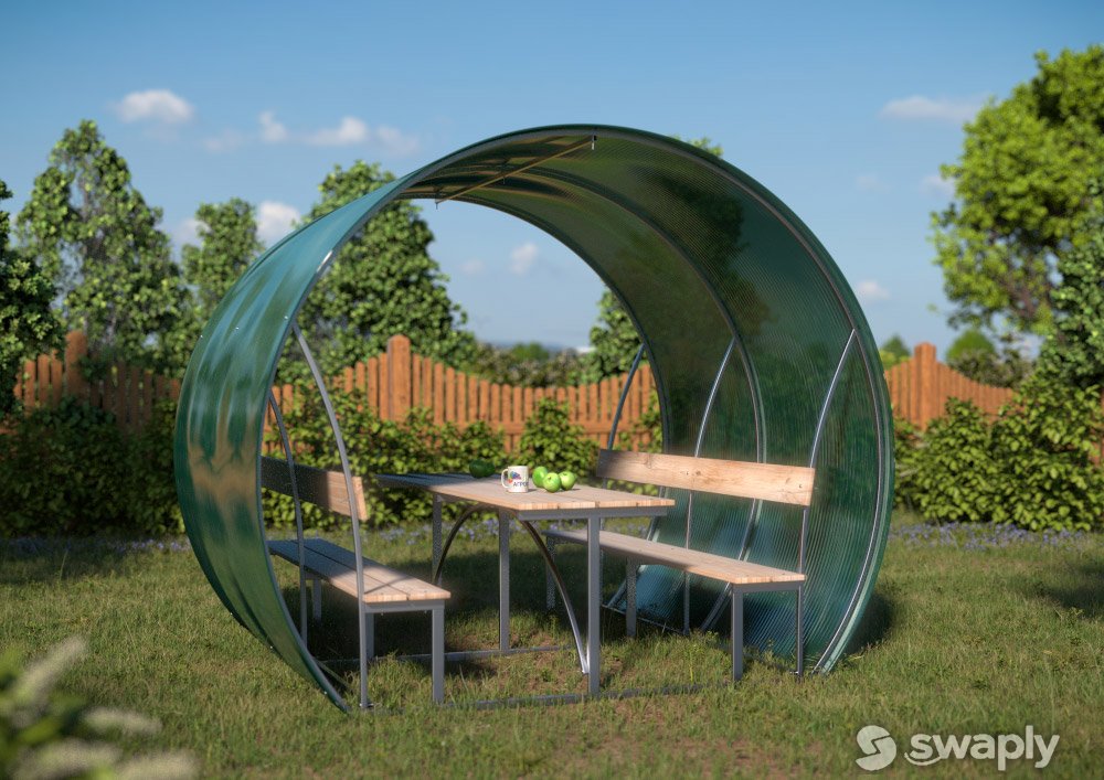 Крыша беседки покрывается сотовым поликарбонатом. Цвет — на любой вкус! Вы можете выбрать расцветку в тон стоящих рядом строений или крыш домов. Особой популярностью пользуются зеленые и коричневые листы. Они особенно не искажают цвета предметов, находящиеся внутри конструкции и подходят под цветовой архитектурный облик большинства строений. Также нейтральными являются молочные и бронзовые листы поликарбоната. Молочный хорошо отражает солнечные лучи, что в жаркую погоду особенно ценно, внутри беседки не так жарко. Красный, вишневый, оранжевый дает соответствующий оттенок на предметы, находящиеся внутри. Прозрачный поликарбонат для таких конструкций не используют.