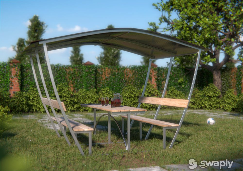Каркас беседки изготовлен из оцинкованного металла, который не требует подкрашивания и будет радовать эстетичным внешним видом в течение длительного времени. В конструкцию добавлена краб — система для обеспечения соединения всех элементов крыши в одной плоскости, что помогает более равномерно распределить снеговую нагрузку зимой. Также добавлены в комплект грунтозацепы для надежного крепления беседки к земле.