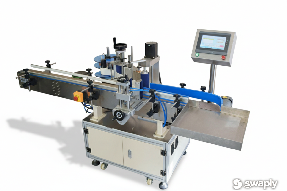 Напольный этикетировщик роликового типа, предназначенный для автоматической горизонтальной маркировки круглых бутылок. Машина поддерживает как одностороннее, так и двухстороннее наклеивание. Роликовый механизм обеспечивает максимально плотный контакт этикетки с поверхностью, исключая дефекты приклейки. Тех. Характеристики