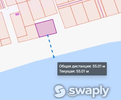 Расстояние до кромки воды около 55 метров (от участка до реки градостроительная зона Р3 - выделена для обеспечения правовых условий сохранения и использования существующего природного ландшафта и создания экологически чистой окружающей среды в интересах здоровья и общего благополучия населения).