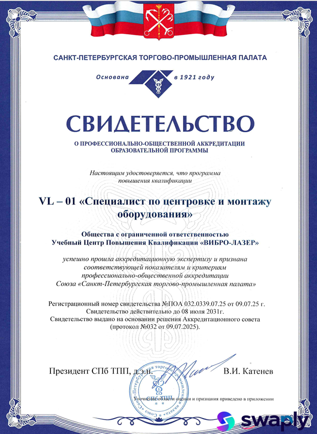 Учебный центр «Вибро-Лазер» проводит обучение по курсу VL-01 «Специалист по центровке и монтажу оборудования». Курс изучается за 5 дней (40 ак.часов в т.ч.: Теория-20ч.; Практика-18ч.; Экзамен-2ч). Теоретические занятия включают изучение требований новых ГОСТ по центровке валов, нормирование показателей несоосности. На практических занятиях отрабатываются алгоритмы действий, проводится работа с часовыми индикаторами и лазерными системами: Vibro-Laser, Easy-Laser, Fixturlaser, Квант-ЛМ. Работы проводятся на горизонтальных и вертикальных стендах.